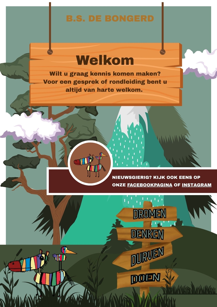 De Bongerd is een school die groots is in het 'klein' zijn. Iedereen kent elkaar, de lijntjes zijn kort. Onze school is een afspiegeling van de huidige maatschappij. Wij stellen het kind centraal en zijn gericht op de totale ontwikkeling van het kind. Ons bevlogen team geeft hier vorm aan middels het concept Dromen, Denken, Doen. In onze schoolgids kunt u meer lezen over onze visie.